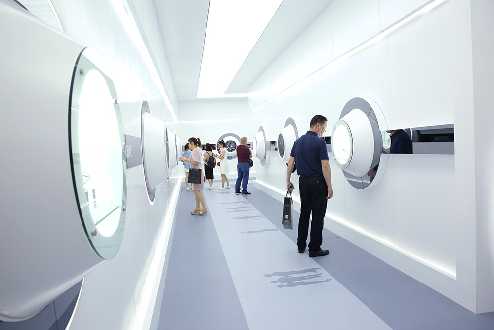 今年的雷諾表展館展臺以波浪形的表帶及表盤合成抽象的圓形表盤,并配以燈光,極具視覺沖擊力,白色的線條猶如鋼琴的琴鍵,流暢而優(yōu)美,環(huán)繞展臺四周,時間與優(yōu)雅的生活完美融合,并在入口處設置時光隧道,光影穿梭,引領(lǐng)全新的商務體驗和潮流。展館內(nèi)的流水幕墻,寓意著時光的流動完美融合其中,展示效果更為生動。